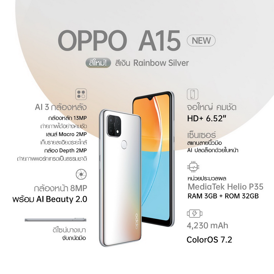 OPPO A15 (New) วางจำหน่ายสีใหม่ "สีเงิน Rainbow Silver" เป็นเจ้าของกันได้ตั้งแต่ 20 ส.ค. 64 เป็นต้นไป ราคา 4,699 บาท