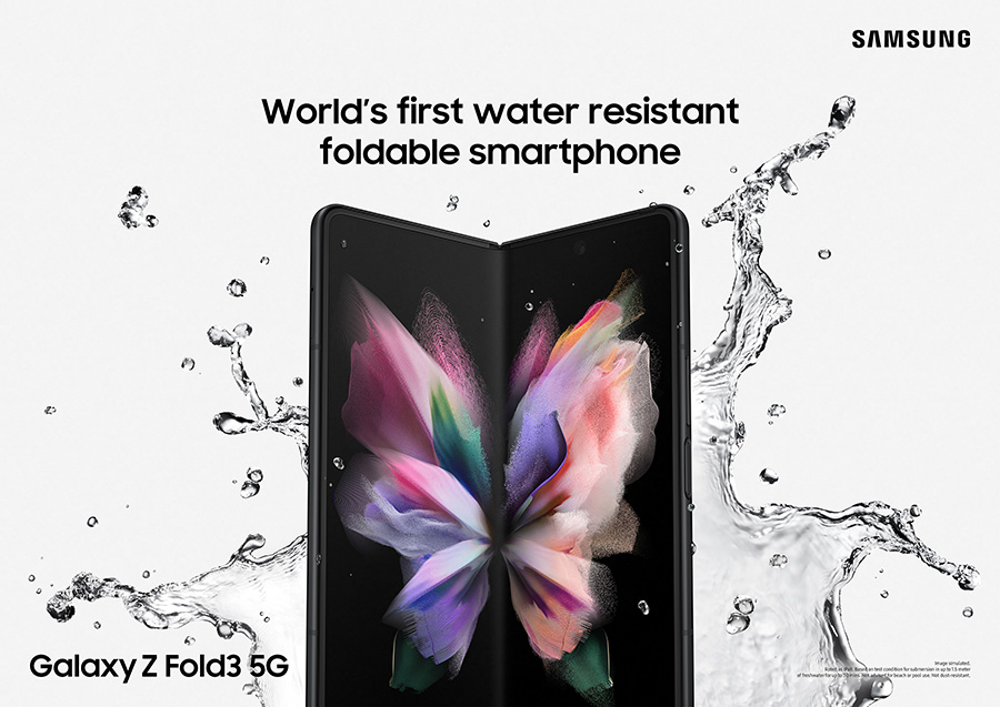 โดยนักออกแบบและวิศวกรของซัมซุงได้คิดค้นวิธีใหม่ ด้วยการเลือกใช้วัสดุที่เคลือบสารพิเศษทำให้ทนทานต่อการกัดกร่อนและเกิดสนิม พร้อมคงอายุการใช้งานที่ยาวนาน รวมถึงเลือกใช้วัสดุที่ทำจากยางเพื่อปิดช่องว่างบริเวณปลายแผงเชื่อมต่อวงจร และป้องกันเมนบอร์ดไม่ให้ลัดวงจรจากการที่น้ำเข้าไปในตัวเครื่อง ด้วยนวัตกรรมใหม่นี้ทำให้ Galaxy Z Fold3 5G ได้รับมาตรฐาน IPX8 รองรับการทนน้ำจืดลึก 1.5 เมตร นาน 30 นาที ทำให้ผู้ใช้เพลิดเพลินกับการใช้งานในชีวิตประจำวันได้มากยิ่งขึ้นกว่าที่เคย
