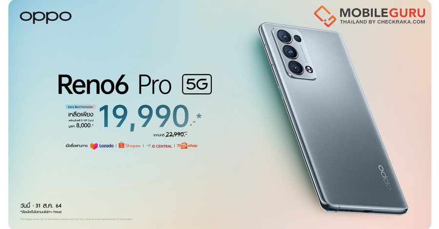 - พิเศษ! โปรโมชั่น Early Bird เมื่อซื้อผ่าน OPPO Official Store บนช่องทาง E-Commerce พิเศษเพียง 19,990 บาท จากปกติ 22,990 บาท พร้อมรับ E-VIP card ประกันหน้าจอแตก 1 ปี มูลค่า 8,000 บาท ตั้งแต่วันที่ 26 สิงหาคม – 31 สิงหาคม 2564