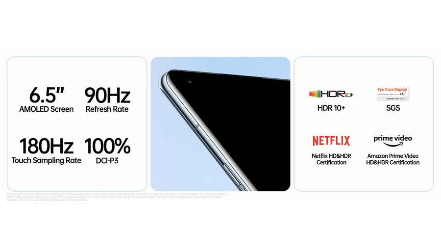 - หน้าจอ AMOLED ขนาด 6.55 นิ้ว ความละเอียด FHD+ 1080 x 2400 pixels (402 ppi), Refresh Rate 90Hz, ความสว่างสูงสุด 1100 nits, HDR10+, กระจก Gorilla Glass 5