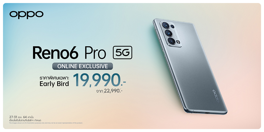 ห้ามพลาด! โปรโมชั่น Early Bird สามารถเป็นเจ้าของ OPPO Reno6 Pro 5G สุดยอดสมาร์ทโฟนพอร์ตเทรตพร้อมสัมผัสความเร็วแรงระดับแฟล็กชิพรุ่นใหม่ล่าสุดได้ก่อนใคร ด้วยราคาพิเศษเพียง 19,990 บาท จากปกติ 22,990 บาท พร้อมรับ E-VIP card ประกันหน้าจอแตก 1 ปี มูลค่า 8,000 บาท ได้แล้วตั้งแต่วันนี้ - 31 สิงหาคม 2564