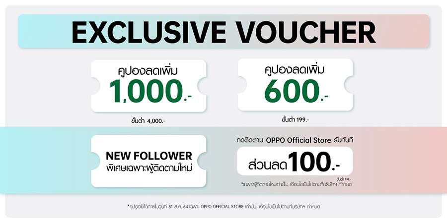 - Follow us! Voucher คูปองพิเศษเมื่อติดตาม OPPO Official Store ตั้งแต่วันที่ 25 สิงหาคม 2564 รับฟรี! คูปองส่วนลด 100 บาท เมื่อซื้อขั้นต่ำ 799 บาท โดยสามารถใช้คูปองได้ในวันที่ 31 สิงหาคม 2564 เท่านั้น