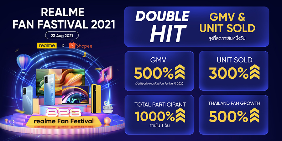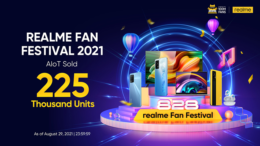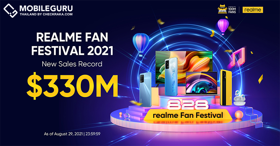 realme แบรนด์สมาร์ทโฟนที่เติบโตเร็วที่สุดในโลก ปิดยอดขายรวม 330 ล้านดอลลาร์ในช่วงเทศกาล realme Fan Festival 2021 เติบโตถึง 38% เมื่อเทียบกับปีที่ผ่านมา แบ่งเป็น ยอดขายสมาร์ทโฟน 1.6 ล้านเครื่อง และอุปกรณ์ AIoT 225,000 เครื่อง