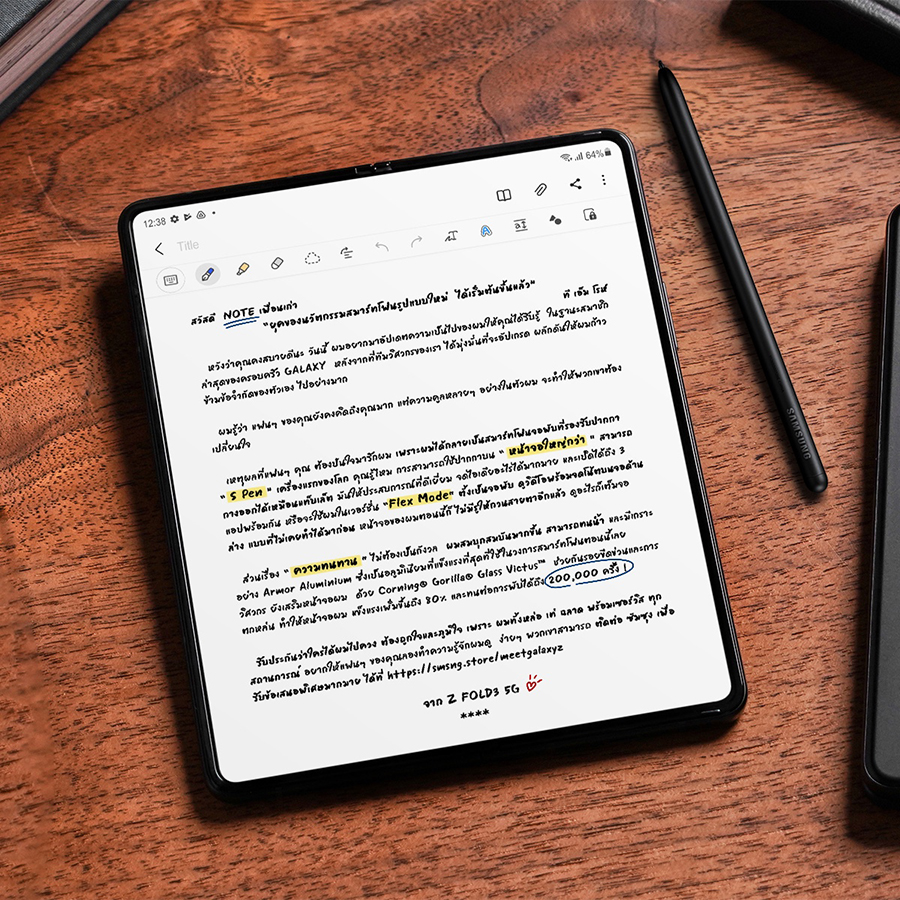 เหตุผลที่แฟนๆ คุณ ต้องปันใจมารักผม เพราะผมได้กลายเป็นสมาร์ทโฟนจอพับที่รองรับปากกา "S Pen" เครื่องแรกของโลก คุณรู้ไหม การสามารถใช้ปากกาบน "หน้าจอใหญ่กว่า" สามารถกางออกได้เหมือนแท็บเล็ต มันให้ประสบการณ์ที่ดีเยี่ยม จดไอเดียอะไรได้มากมาย และเปิดได้ถึง 3 แอปพร้อมกัน หรือจะใช้ผมในเวอร์ชั่น "Flex Mode" ตั้งเป็นจอพับ ดูวิดีโอพร้อมจดโน้ตบนจอด้านล่าง แบบที่ไม่เคยทำได้มาก่อน หน้าจอของผมตอนนี้ก็ ไม่มีรูให้กวนสายตาอีกแล้ว ดูอะไรก็เต็มจอ