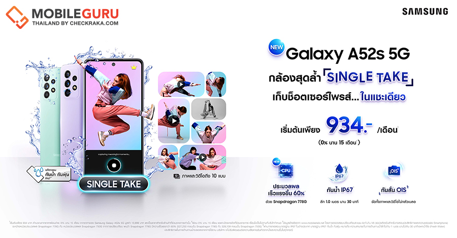 เปิดตัวสมาชิกใหม่ล่าสุด Samsung Galaxy A52s 5G สมาร์ทโฟนที่ตอบโจทย์ทุกมิติของการทำคอนเทนต์อย่างแท้จริง นำโดยฟีเจอร์กล้องสุดล้ำอย่าง Single Take ที่สามารถเก็บครบทุกโมเมนต์พิเศษได้ในช็อตเดียว พร้อมอัดแน่นเทคโนโลยีระดับพรีเมียมมากมาย ทั้งชิปเซ็ตใหม่ที่เร็วแรงกว่าเดิมถึง 60% ไปจนถึงประสิทธิภาพการกันน้ำและฝุ่น รวมถึงความสามารถอื่นๆ อีกมากมายที่ตอบรับ Insights ของผู้ใช้ Gen Z เรียกได้ว่า จบ ครบ ในเครื่องเดียว การันตีความคุ้มค่าที่สุดในตลาดสมาร์ทโฟนระดับราคา 13,999 บาท โดยมาพร้อมดีลพิเศษ กับราคาเริ่มต้นเพียง 934 บาทต่อเดือนเท่านั้น!