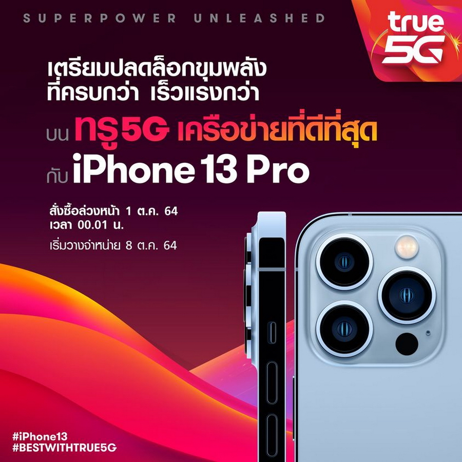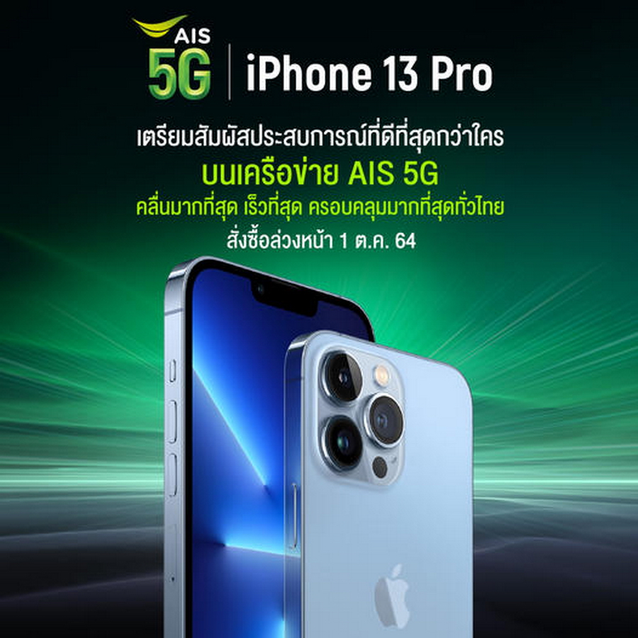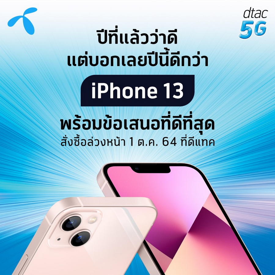AIS, dtac และ TrueMove H พร้อมเปิดจอง iPhone 13 Series ในวันที่ 1 ต.ค. 64 พร้อมวางจำหน่าย 8 ต.ค. 64 พบกับสมาร์ทโฟนจาก Apple ที่ดีที่สุดเท่าที่เคยมีมาครบทั้ง 4 รุ่นย่อย iPhone 13 Mini, iPhone 13, iPhone 13 Pro และ iPhone 13 Pro Max มาพร้อมการเปลี่ยนแปลงที่น่าสนใจมากยิ่งขึ้น ไม่ว่าจะเป็นหน้าจอ Super Retina XDR OLED ที่รองรับ Refresh Rate 120hz, ชิปเซ็ต Apple A15 Bionic ที่แรงที่สุดในตอนนี้, ระบบกล้องที่พัฒนาให้ดียิ่งขึ้น, รองรับมาตรฐานกันน้ำและฝุ่น IP68, แบตเตอรี่ที่ใช้งานได้นานขึ้น มาพร้อมชาร์จเร็ว 20W และรองรับชาร์จไร้สาย 7.5W (เมื่อใช้งานคู่กับอุปกรณ์เสริม MagSafe จะชาร์จไร้สายที่ 15W)