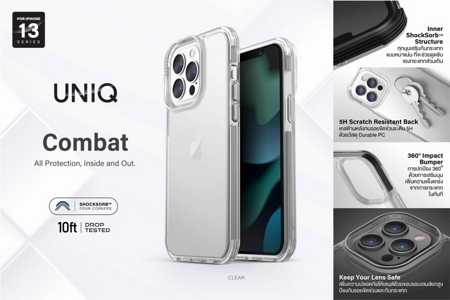 Uniq เคส iPhone 13 รุ่น COMBAT เป็นเคสที่ออกแบบมาด้วยโครงสร้างที่แข็งแรง สามารถรองรับแรงกระแทกอย่างทรหดด้วยเทคโนโลยีการปกป้องถึง 3 ชั้น การปกป้องรอบด้าน 360 องศา ด้วยการเสริมมุมเพิ่มความแข็งแกร่งจากการกระแทกในทันที ผสานการปกป้องด้วยกันชนกันกระแทกแบบหนาแน่น ShockSorb ที่มีอยู่ในบริเวณด้านข้างของเคสและที่มุมทั้ง 4 มุม ที่จะช่วยดูดซับแรงกระแทกส่วนเกินจากการตกกระแทก เคสด้านหลังทนรอยขีดข่วนระดับ 5H ด้วยวัสดุ Durable PC รวมถึงตัวเคสผ่านการทดสอบว่าสามารถรองรับแรงกระแทกจากการตกจากที่สูงได้ถึง 10 ฟุต และเพิ่มความปลอดภัยให้เลนส์ด้วยขอบรอบเลนส์ยกสูง ป้องกันรอยขีดข่วนและกันกระแทก ทำให้มั่นใจว่าเคสจะสามารถปกป้องไอโฟนของคุณได้ทั้งภายในและภายนอกได้ในทุกกิจกรรม โดย Uniq เคส iPhone 13 Series รุ่น COMBAT มี 1 สี คือ สี Clear วางจำหน่ายในราคา 790 บาท