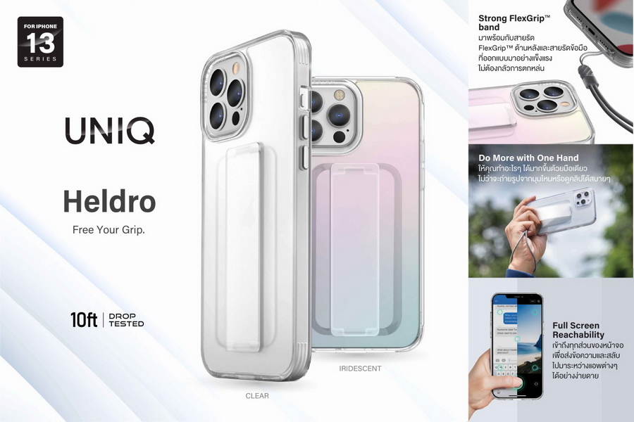 Uniq เคส iPhone 13 รุ่น HELDRO เป็นเคสใสกันกระแทก มาพร้อมกับสายรัด FlexGrip ด้านหลัง เพื่อให้สามารถใช้งาน iPhone ด้วยมือเดียวได้อย่างคล่องตัว และยังมาพร้อมสายคล้องข้อมือที่ออกแบบมาอย่างแข็งแรงเพื่อความปลอดภัยสูงสุด ไม่ต้องกลัวการตกหล่น ให้คุณทำอะไรๆ ได้มากขึ้นด้วยมือเดียว ไม่ว่าจะถ่ายรูปจากมุมไหนหรือเข้าถึงทุกส่วนของหน้าจอ เพื่อส่งข้อความและสลับไปมาระหว่างแอพต่างๆ ได้อย่างง่ายดาย ตัวเคสใสด้านหลังแบบแข็งผลิตจากวัสดุ PC ทนต่อการกระแทกและรอยขีดข่วน เสริมการปกป้องรอบด้านด้วยขอบกันกระแทกผลิตจากวัสดุ TPU และด้านในทุกมุมเสริมตัวช่วยดูดซับแรงกระแทกขั้นสุด อีกทั้งตัวเคสผ่านการทดสอบว่าสามารถรองรับแรงกระแทกจากการตกจากที่สูงได้ถึง 10 ฟุตเลยทีเดียว เพิ่มความปลอดภัยให้เลนส์ด้วยขอบรอบเลนส์ยกสูง ป้องกันรอยขีดข่วนและกันกระแทก โดย Uniq เคส iPhone 13 Series รุ่น HELDRO มีให้เลือก 2 สี ได้แก่ สี Clear และ สี Iridescent วางจำหน่ายในราคา 990 บาท
