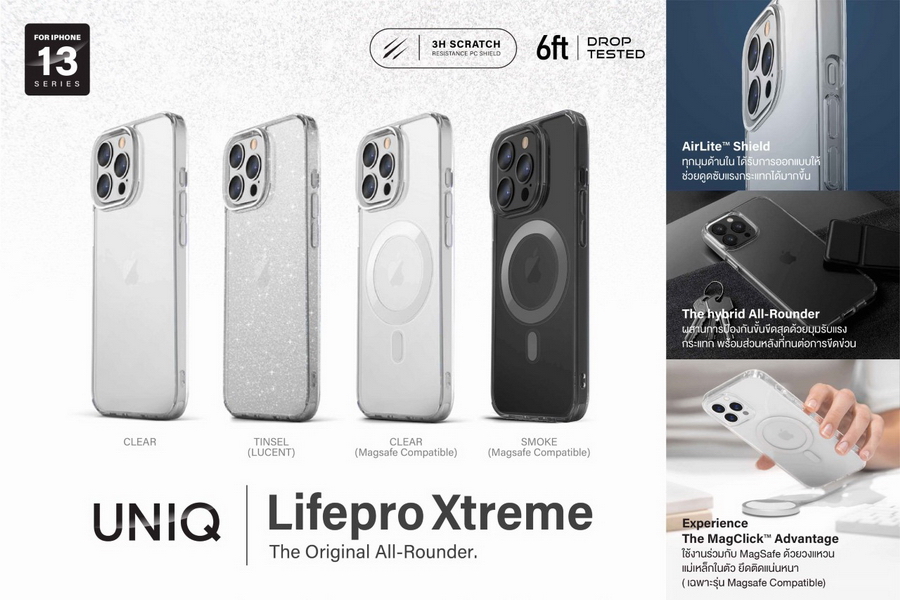 Uniq เคส iPhone 13 รุ่น LIFEPRO XTREME, รุ่น LIFEPRO XTREME TINSEL และ รุ่น LIFEPRO XTREME (Magsafe Compatible) ทั้ง 3 รุ่นนี้เป็นเคสใสกันกระแทกแบบบางเบา ให้การปกป้องขั้นขีดสุดด้วยมุมรับแรงกระแทกผลิตจากวัสดุ TPU โดยตัวเคสด้านหลังผลิตจากวัสดุ PC แบบแข็งมาตรฐานป้องกันรอยขีดข่วนระดับ 3H ผสานการปกป้อง iPhone รอบด้านด้วยเทคโนโลยี AirLite ที่ทุกมุมด้านใน ได้รับการออกแบบให้ช่วยดูดซับแรงกระแทกได้มากขึ้น ขณะที่ตัวเคสผ่านการทดสอบว่าสามารถรองรับแรงกระแทกจากการตกจากที่สูงได้ถึง 2 เมตร ยิ่งไปกว่านั้นเพิ่มความปลอดภัยให้เลนส์ด้วยขอบรอบเลนส์ยกสูง ป้องกันรอยขีดข่วนและกันกระแทก สำหรับในรุ่น LIFEPRO XTREME TINSEL ตัวเคสผสม 3D Glitter ลงในเนื้อเคสทำให้ทนต่อการซีดจางและให้ความแวววาวระดับพรีเมียม อีกทั้งในรุ่น LIFEPRO XTREME (Magsafe Compatible) ยังมาพร้อม MagClick ที่ยึดติดอย่างแน่นหนา สำหรับใช้งานร่วมกับ MagSafe ด้วยวงแหวนแม่เหล็กในตัว โดย