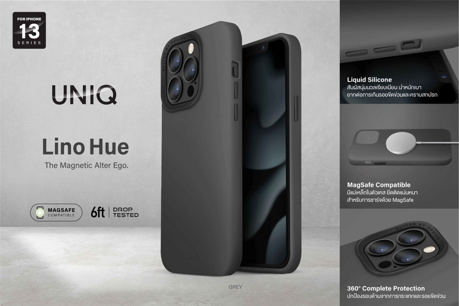 Uniq เคส iPhone 13 รุ่น LINO HUE (Magsafe Compatible) เป็นเคสที่น้ำหนักเบาเป็นพิเศษ ผลิตจากวัสดุ Liquid Silicone เกรดพรีเมียม ให้สัมผัสที่นุ่มนวลเรียบเนียน เสริมด้วยโครงสร้างการปกป้องที่แข็งแรงแบบไฮบริดถึงสองชั้น อีกทั้งยังมาพร้อมเทคโนโลยี The Latest Coating ที่ช่วยป้องกันฝุ่นและยากต่อการเกิดคราบสกปรก รวมถึงป้องกันลายนิ้วมือได้อย่างดีเยี่ยม ภายในตัวเคสด้านในซับด้วย Microfiber ให้การปกป้องไอโฟนของคุณได้สมบูรณ์แบบ 360 องศา รวมถึงตัวเคสผ่านการทดสอบว่าสามารถรองรับแรงกระแทกจากการตกจากที่สูงได้ถึง 6 ฟุต มีแม่เหล็กในตัวเคส ยึดติดแน่นหนา สำหรับการชาร์จด้วย MagSafe และเพิ่มความปลอดภัยให้เลนส์ด้วยขอบรอบเลนส์ยกสูง ป้องกันรอยขีดข่วนและกันกระแทก โดย Uniq เคส iPhone 13 Series รุ่น LINO HUE (Magsafe Compatible) มี 1 สี คือ สี Grey วางจำหน่ายในราคา 990 บาท