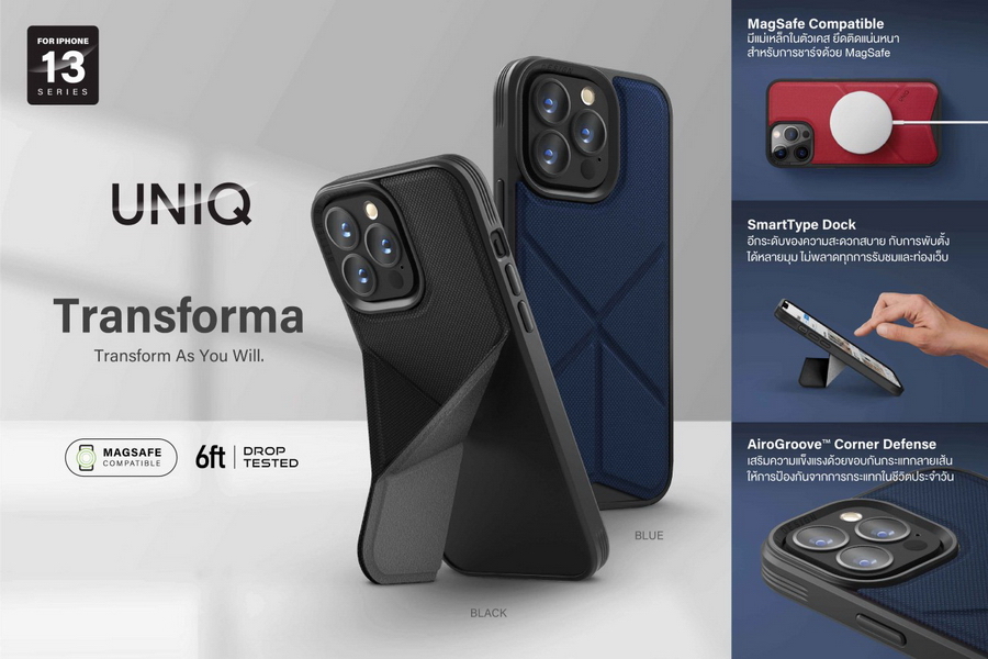 Uniq เคส iPhone 13 รุ่น TRANSFORMA (Magsafe Compatible) เป็นเคสแบบพับ เพื่อให้ตั้งได้ทั้งแนวตั้งและแนวนอน สะดวกในการดูคอนเทนต์ต่างๆ ผ่าน iPhone ดีไซน์เรียบง่าย ด้านหลังเคสผลิตจากวัสดุ PU คุณภาพสูงกันกระแทกและทนรอยขีดข่วน ด้านในเคสซับด้วยวัสดุ Microfiber มีแม่เหล็กในตัวเคส ยึดติดแน่นหนา สำหรับการชาร์จด้วย MagSafe ให้การปกป้อง iPhone รอบด้าน 360 องศา ด้วยขอบกันกระแทกวัสดุ TPU ผสานการปกป้องด้วยเทคโนโลยี AiroGroove ที่เสริมความแข็งแรงด้วยขอบกันกระแทกแบบลายเส้น ให้การป้องกันจากการกระแทกในชีวิตประจำวัน ให้คุณได้สัมผัสกับประสบการณ์ใหม่อีกระดับของความสะดวกสบาย ด้วยการพับตั้งได้หลายมุมได้ทั้งแบบแนวตั้งและแนวนอน ไม่พลาดทุกการรับชมและท่องเว็บ เพิ่มความปลอดภัยให้เลนส์ด้วยขอบรอบเลนส์ยกสูง ป้องกันรอยขีดข่วนและกันกระแทก โดย Uniq เคส iPhone 13 Series รุ่น TRANSFORMA (Magsafe Compatible) มีให้เลือก 2 สี ได้แก่ สีน้ำเงิน และ สีดำ วางจำหน่ายในราคา 890 บาท
