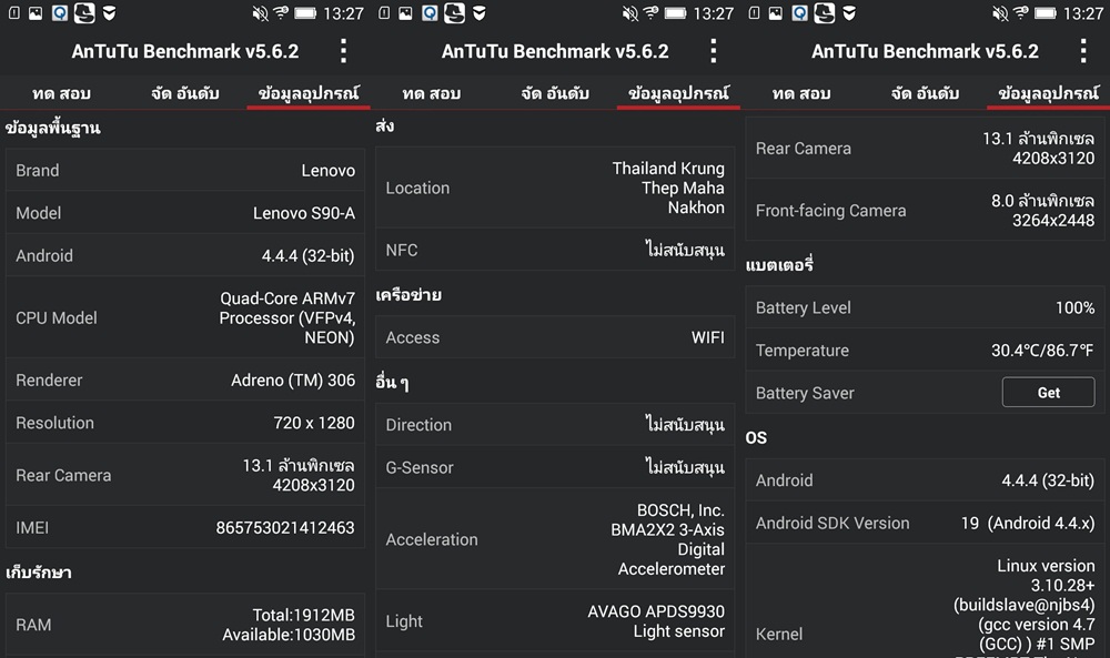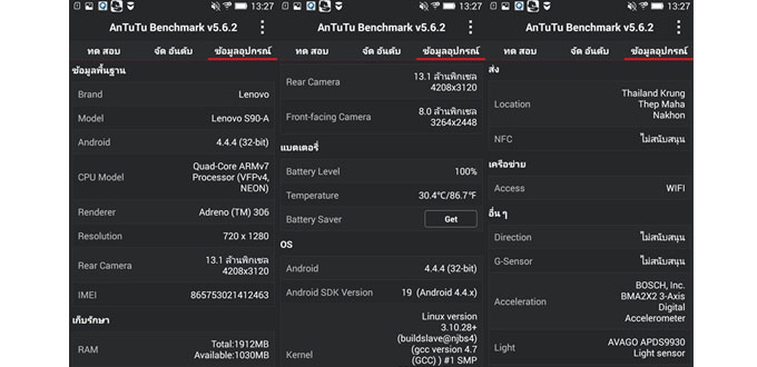 ข้อมูลสเปคเครื่อง จาก App AnTuTu สำหรับการเชื่อมต่อนั้น Lenovo S90 พร้อมรองรับทุกสิ่ง เช่น
