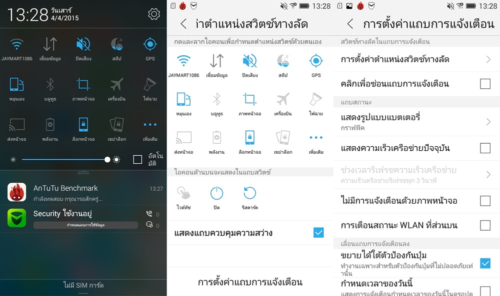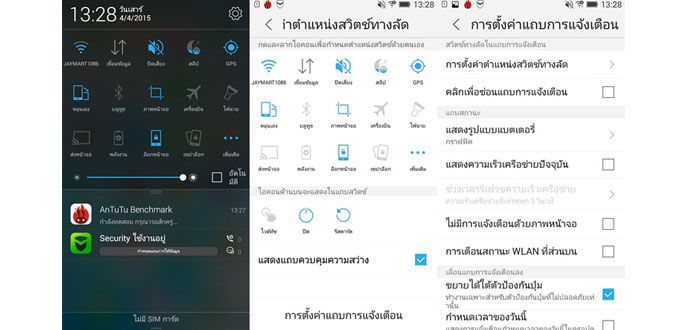 ในส่วนของหน้าจอการแจ้งเตือน ก็จะมีการแสดงปุ่มลัดสำหรับตั้งค่าเบื้องต้น ไม่ว่าจะเป็นการเชื่อมต่อ Wi-Fi, Data, ปิดเสียง, เวลาปิดหน้าจอ, GPS กับแถบการตั้งความสว่างหน้าจอ หรือถ้าต้องการตั้งค่าเพิ่มก็สามารถลากลงมา เพื่อเลือกปรับการหมุนหน้าจอ บลูทูธ จับภาพหน้าจอ เปิดโหมดเครื่องบิน ไฟฉาย ส่งหน้าจอ ล็อกหน้าจอ ได้เพิ่มเติม