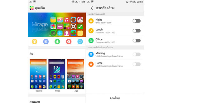 นอกจากนั้นยังมีส่วนของศูนย์ธีม ที่ผู้ใช้สามารถเข้าไปเลือกธีมเพื่อใช้งานได้ ตามความต้องการ โดยจะมีให้เลือกทั้งธีม ภาพพื้นหลัง ภาพล็อกหน้าจอ และภาพขณะเปิดเครื่อง โดยเบื้องต้นจะมีธีมมาให้เลือก 6 แบบ ภาพล็อกหน้าจอ 8 แบบ และภาพขณะเปิดเครื่อง 3 แบบ