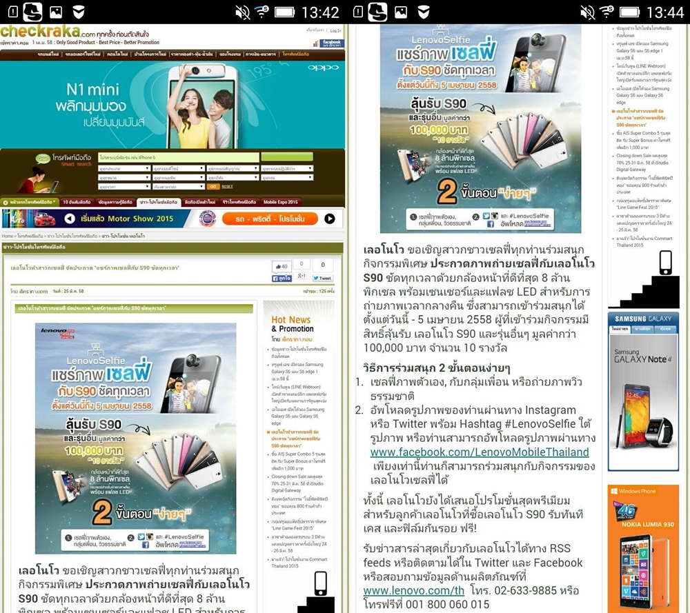ในกล่องมีอะไรบ้าง: ถือว่าอุปกรณ์ภายในกล่องค่อนข้างครบเลยทีเดียว หูฟังสมอลทอล์ค, สาย USB / ชาร์จไฟ, สายอะแดปเตอร์สำหรับชาร์จไฟ, ที่จิ้ม Sim, เคสกันรอย, ฟิล์มกันรอย, ใบรับประกัน, คู่มือการใช้งาน ซึ่งตอนที่เราได้เครื่องมานั้น มีฟิล์มกันรอย และเคสกันรอยใส่ไว้กับตัวเครื่องให้เรียบร้อยแล้วค่ะ เรียกได้ว่าอุปกรณ์ครบชุด ค่อนข้างพอใจสำหรับคนที่ไม่อยากยุ่งยากไปหาเคสและฟิล์มกันรอยเองค่ะ ราคา: ราคาของ Lenovo S90 อยู่ที่ 9,990 บาท ถ้าถามว่าคุ้มค่าไหมกับการราคาและสเปคขนาดนี้ ถ้าถามคนเขียน ก็ถือว่าคุ้มค่าอยู่เหมือนกัน โดยรวมๆ ทั้งสเปค ฟังก์ชั่นการใช้งานต่างๆ ถือว่าคุ้มค่าเลยทีเดียว ดีไซน์: นับว่าทำได้ดี ดูโดดเด่นอยู่เหมือนกัน เอาเป็นว่าใครเห็นก็อยากสัมผัสเพราะด้วยรูปทรงที่บางจับง่ายวัสดุ ดูหรูหรานั่นเอง หน้าจอ: ถือว่าคมชัด สีสันสดใสสะดุดตามากเช่นกัน ทำให้เวลาถ่ายภาพ หรือดูหนังฟังเพลง หรือเล่นเกมนั้น เราจะรู้สึกได้ว่าภาพนั้นสมจริงมากๆ อินเทอร์เฟสและฟังก์ชัน: นับได้ว่ามีเอกลักษณ์เป็นของตัวเองเป็นอย่างมาก ในเรื่องของอินเตอร์เฟสการใช้งาน Lenovo S90 นั้น การนำอินเตอร์เฟส Vibe UI v.2 ของ Lenovo มาครอบ ก็ช่วยทำให้ S90 นั้นน่าสนใจมากขึ้น เพราะได้มีการรวมแอปพลิเคชั่นต่างๆ ที่ใช้งานมาไว้ในหน้าหลัก ทำให้ไม่ต้องกดเข้าไปในหน้ารวมแอป ให้เสียเวลา การประมวลผล: Lenovo S90 หน่วยประมวลผลแบบ Quad-Core 64-bit ARM Snapdragon 410 ความเร็ว 1.2 GHz หลังจากที่ได้ลองเล่นลองใช้งานแล้ว ถือว่าความลื่นไหลของเครื่อง การเปิดแอปต่างๆ การเล่นเกมนั้นไม่มีกระตุกหรือสะดุดเลย ส่วนพื้นที่เก็บบันทึกข้อมูลภายในขนาด 32 GB จะเหลือให้ใช้งานได้จริงประมาณ 24.32 GB ไม่รองรับการใส่การ์ดหน่วยความจำเพิ่มแบบ microSD Card การถ่ายภาพ: ในส่วนของการถ่ายภาพนั้น Lenovo S90 ต้องยอมรับจริงๆ ว่ากล้องเขาดีมาก กล้องหลัง 13 ล้านพิกเซลพอถ่ายออกมาแล้วคุณภาพของภาพถ่ายนั้นยังถือว่าคมชัดอยู่ การใช้งานในฟังก์ชั่นนี้ไม่ยุ่งยาก มีปุ่มปรับตั้งค่าไม่เยอะเท่าไหร่ ใช้งานได้ง่าย ส่วนกล้องหน้าความละเอียด 5 ล้านพิกเซลบวกกับโหมดบิวตี้ (Beauty) ก็เหมาะสำหรับสาวๆ ที่ชอบในการถ่ายภาพเป็นชีวิตจิตใจ เพราะถ่ายออกมาแล้วคนละคนเลยทีเดียว สรุปโดยรวม: จากที่ได้สัมผัสมาทั้งในด้านการใช้งานต่างๆ รูปทรงวัสดุ ราคา โดยรวมแล้วถือว่าคุ้มค่ามากๆ ค่ะ ด้วยราคาเพียงแค่ 9,990 บาท แต่ได้อุปกรณ์ครบชุด รวมเคส+ฟิล์มกันรอย แถมการใช้งานในด้านต่างๆ ยังครบถ้วนไม่ว่าจะเป็นกล้องที่คมชัดทั้งหน้าและหลัง หน่วยประมวลผลตัวเครื่อง Quad-Core 64-bit ARM Cortex-A53 Processor (ชิปเซ็ต Qualcomm MSM8916 Snapdragon 410) ความเร็วในการประมวลผ