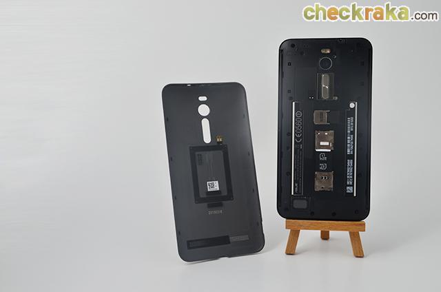 เมื่อถอดฝาหลังของ ASUS Zenfone 2 ออก คุณจะเห็นแบตเตอรี่ (ถอดเปลี่ยนเองไม่ได้) ที่ใส่ซิม 2 อัน และที่ใส่การ์ด MicroSD