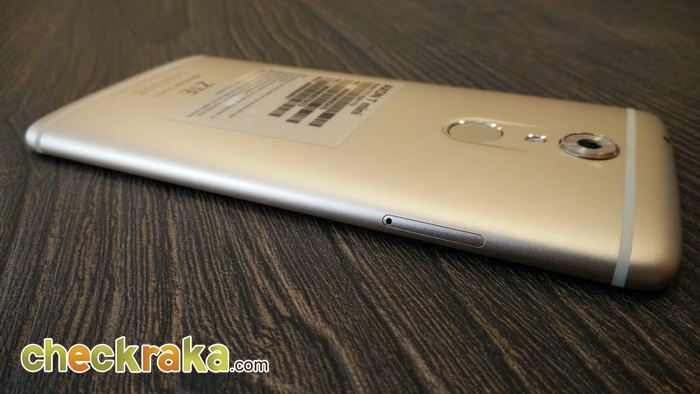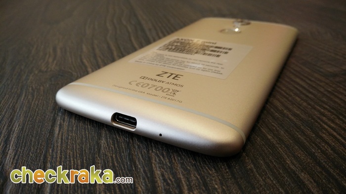 รุ่นนี้กล้องด้านหลังจะนูนขึ้นเล็กน้อยต้องระวังซักหน่อยนะครับ ความละเอียด 16 MP ค่ารูรับแสง f/1.9 และตรงเซ็นเซอร์สแกนลายนิ้วมือ ออกแบบให้เว้าเล็กน้อยซึ่งนอกจากสวยแล้ว ยังช่วยให้แตะสแกนนิ้วได้แม่นยำยิ่งขึ้น ด้านล่างถัดจาก ZTE จะมีโลโก้ของ Dolby ATMOS อยู่ด้วย