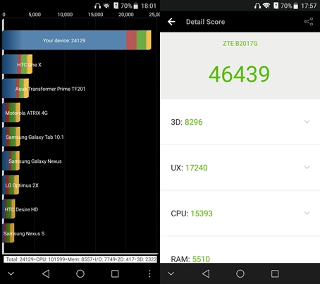 ZTE AXON 7 Mini สเปคดูดีทีเดียวครับ ชิปเซ็ต Qualcomm MSM8952 Snapdragon 617, CPU Octa-core (4x1.5 GHz Cortex-A53 & 4x1.2 GHz Cortex-A53), GPU Adreno 405, RAM 3GB, หน่วยความจำ 32GB (สามารถเพิ่มได้สูงสุด 256GB) มาดูคะแนนทดสอบกัน