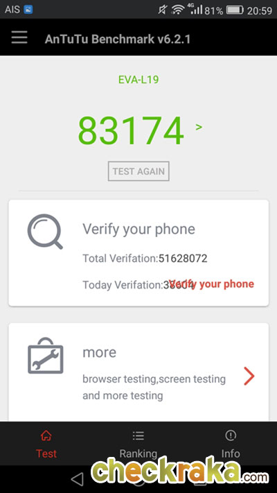ผลการทดสอบประสิทธิภาพความเร็วด้วย Antutu Benchmark ได้ 83,174 คะแนน