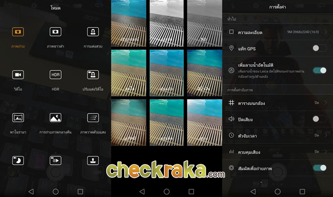ในส่วนซอฟต์แวร์กล้องถ่ายภาพยังคงเอกลักษณ์ของ Huawei ไว้เน้นใช้งานง่าย แต่จะมีการปรับฟอนต์และเสียงชัตเตอร์ให้เป็นแบบ Leica ทั้งโหมดถ่ายภาพจะเพิ่ม Monochrome Mode เข้ามา ส่วนโหมดถ่ายภาพพิเศษอย่าง Light Painting และ Night Shot, Timelapse จะมีให้เลือกใช้งานในแบบเดิม รวมถึงมี Manual Mode รองรับเฉพาะโหมดถ่ายภาพ Photo และ Monochrome ที่เปิดใช้งานง่ายเพียงจิ้มที่ขีดสีขาวเหนือปุ่มชัตเตอร์แล้วตวัดขึ้นเท่านั้นจะพบหน้าตาส่วนปรับตั้งค่ากล้องถ่ายภาพ