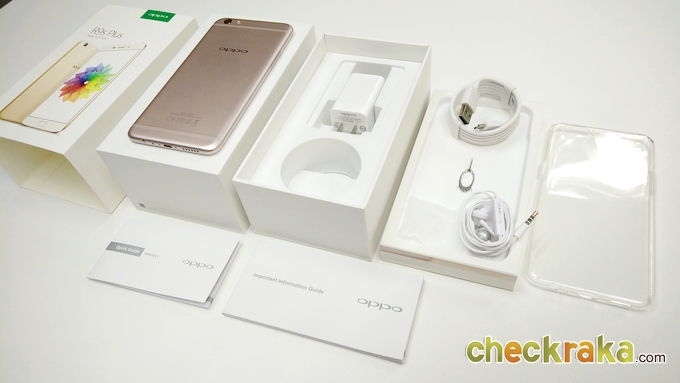 กล่องของ OPPO R9s Plus ดูดีมากครับ เป็นกระดาษแข็งหนาๆ ดูพรีเมี่ยม และมีแจ็กเก็ตสวมอีกชั้นด้วย ภายในกล่องจะมีอุปกรณ์ดังต่อไปนี้