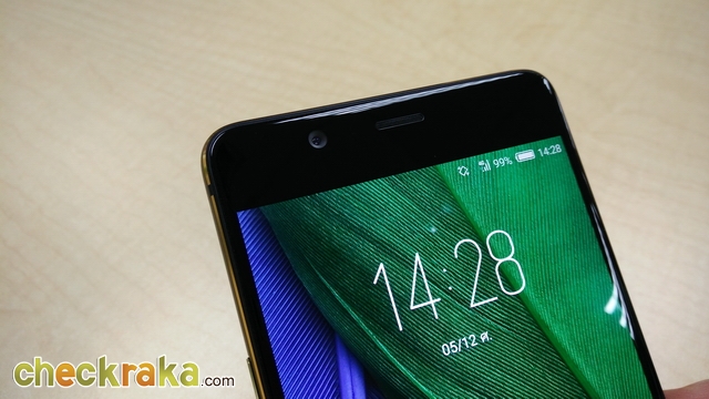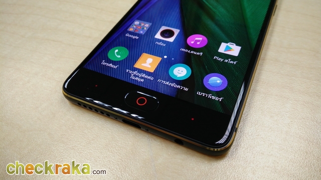 ด้านหน้าจะมีกล้องความละเอียด 16MP ค่ารูรับแสง F2.0 สำหรับการ Selfie และมุมกล้องกว้าง 80 องศา ถัดมาเป็นเซ็นเซอร์ และลำโพงสนทนา ด้านล่างปุ่มโฮมจะเป็นเซ็นเซอร์สแกนลายนิ้วมือแบบสัมผัส ด้านซ้ายและขวาจะเป็นปุ่มสัมผัส สามารถปรับสลับ Back กับ Menu ได้ตามความถนัด และทำหน้าที่เป็น Notification Light ไปในตัวด้วย ไฟสีแดงเท่มากๆ