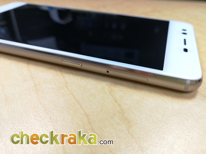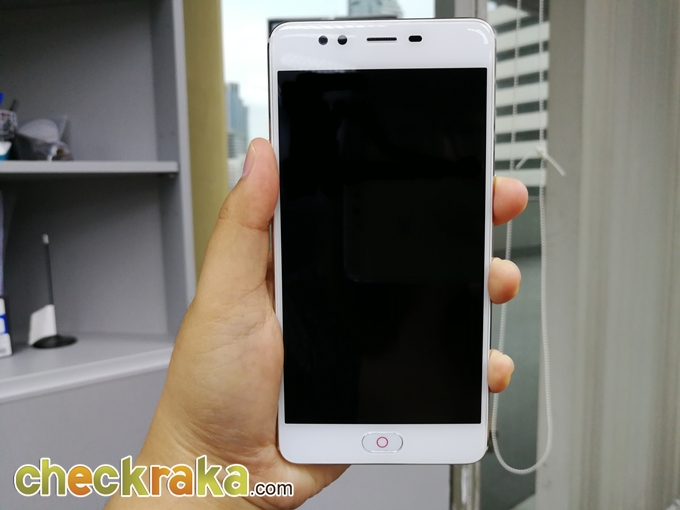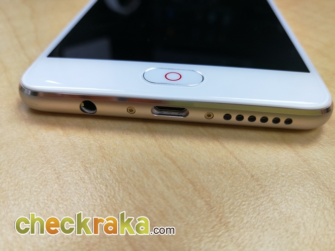 ด้านบนหน้าจอมีกล้องหน้าความละเอียด 16 ล้านพิกเซล ลำโพงสนทนา และเซ็นเซอร์ ส่วนล่างหน้าจอมีปุ่มโฮมที่มีเซ็นเซอร์สแกนลายนิ้วมือในตัว และทางด้านซ้ายและขวาของปุ่มโฮม ก็คือ ปุ่ม setting และ ปุ่ม back เราสามารถตั้งค่าได้ว่าจะให้อะไรอยู่ซ้าย อะไรอยู่ขวา ถ้าเราจะเรียกใช้งาน recent apps ก็ต้องกด back ค้างเอา