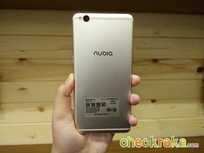 ด้านหลังนั้นมีโลโก้ nubia อยู่ตรงกลาง และมีกล้องหลังความละเอียด 13 ล้านพิกเซล มีขอบสีแดงล้อมรอบนูนขึ้นมาเล็กน้อยเพื่อป้องกันเลนส์ ด้านข้างเป็นไฟแฟลช LED พร้อมกับแถบเสาสัญญาณด้านบนและล่าง