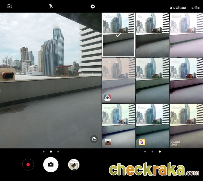 ถ้าปัดหน้าจอมาทางด้านซ้ายจะเป็นการเลือกโหมดถ่ายภาพในแบบต่างๆ คือ อัตโนมัติ / โหมดโปร / โหมดพาโนรามา / โหมดถ่ายภาพต่อเนื่อง / โหมด HDR / โหมดถ่ายภาพกลางคืน และโหมดถ่ายภาพอาหาร หากปัดมาทางด้านขวาจะเป็นการเลือกฟิลเตอร์รูปแบบต่างๆ
