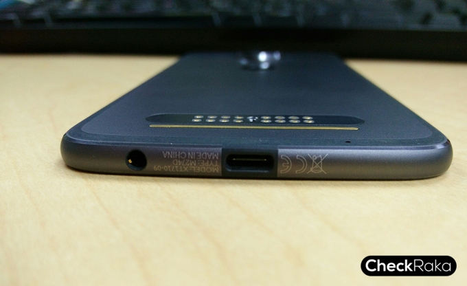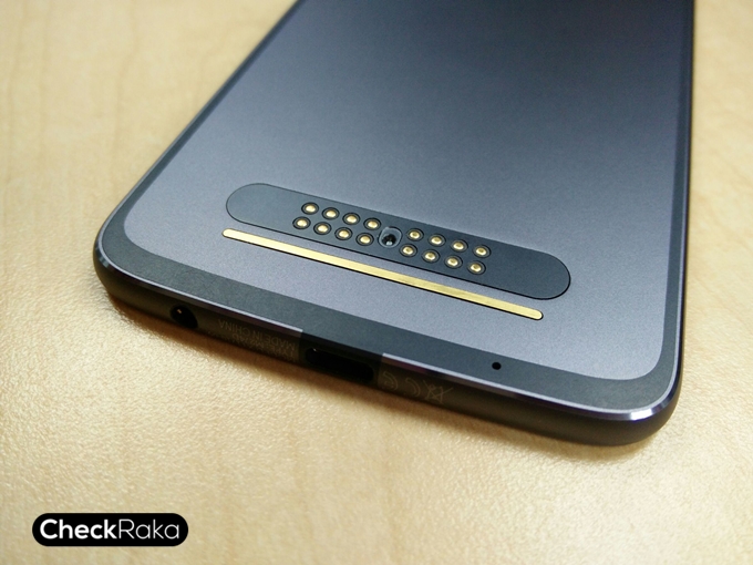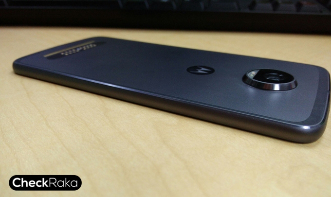 ด้านหลังของตัวเครื่อง กล้องหลังความละเอียด 12 ล้านพิกเซล พร้อมแฟลช Dual-Tone LED ถัดมาข้างล่างจะมีจุดเชื่อมต่ออุปกรณ์เสริม Moto Mods