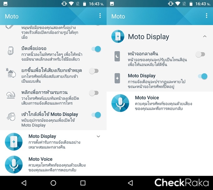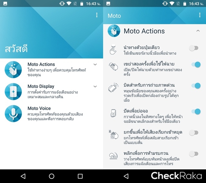 นอกจากนี้ยังมาพร้อม Moto Actions โดย Moto Actions คือ ฟังก์ชั่นสำหรับเปิดใช้งานทางลัด เพื่อเข้าใช้งานได้อย่างรวดเร็ว เพียงเลือกใช้งานด้วยการเปิด-ปิด เท่านั้น ผู้ใช้งานสามารถสั่งงานด้วยท่าทางต่างๆ ได้ เช่น กวาดนิ้วเพื่อย่อขนาดหน้าจอ, เขย่าเครื่องสองครั้งเพื่อเปิดไฟฉาย, บิดเครื่องสองครั้งเพื่อเรียกใช้งานกล้องถ่ายภาพ, พลิกคว่ำตัวเครื่องเพื่อปิดเสียง หรือปิดการแจ้งเตือนต่างๆ หรือการยกเครื่องเพื่อปิดเสียง