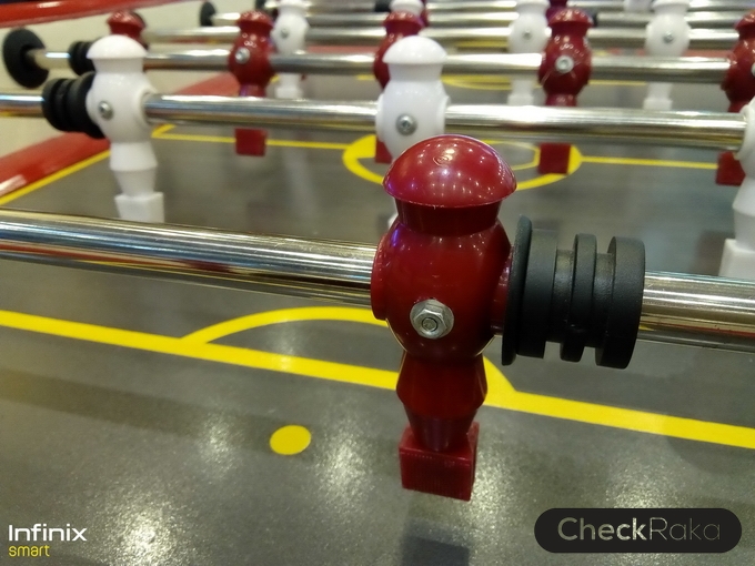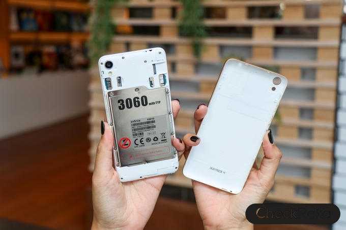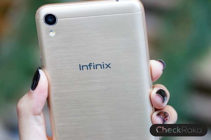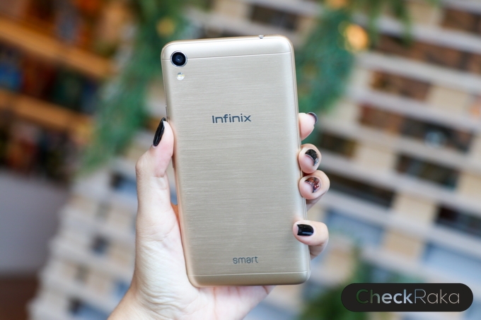 ด้านหลังดูเรียบหรู ผิววัสดุมีการออกแบบเหมือนผิวโลหะขัดลาย จับแล้วให้ความรู้สึกที่ดีและกันลื่นไปในตัว มีกล้องความละเอียด 8MP อยู่ที่มุมบนด้านซ้าย และไฟแฟลชคู่ LED ด้านหลังมีโลโก้ Infinix อยู่ตรงกลาง และด้านล่างมีชื่อรุ่น Smart สำหรับฝาหลังเวลาแกะต้อง ถอดออกมาทั้งชิ้น รวมไปถึงด้านข้างตัวเครื่อง โดยจะมีร่องเล็กๆ สำหรับแกะฝาหลังอยู่ที่ด้านล่างขวามือ แกะง่ายครับไม่ยาก