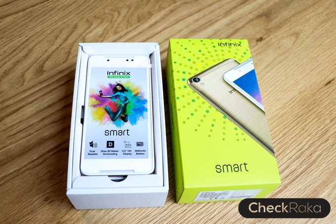 ตัวเครื่อง Infinix Smart อแดปเตอร์ชาร์จไฟ สาย Micro USB หูฟัง Earbuds คู่มือ Infinix Smart มีดีไซน์ที่สวยงาม ขนาดกะทัดรัด วัสดุจะเป็นพลาสติก สำหรับเครื่องที่ได้รับมารีวิวในครั้งนี้จะเป็นสีทอง Champagne Gold ด้านหน้าจะเป็นสีขาว โดดเด่นด้วยลำโพงคู่ที่มาพร้อมเทคโนโลยี Direc Stereo Widening (3D Stereo surrounding) เสียงดังดีมากครับ คุณภาพเสียงจัดว่าโอเคทีเดียว สามารถเปิดเพลงฟังกับเพื่อนๆ หรือตอนเล่นเกมก้ได้อารมณ์ดีมากเลยครับ