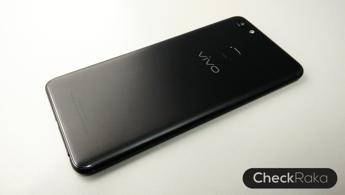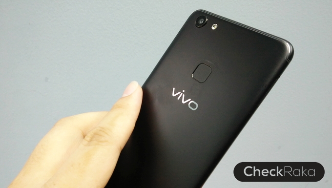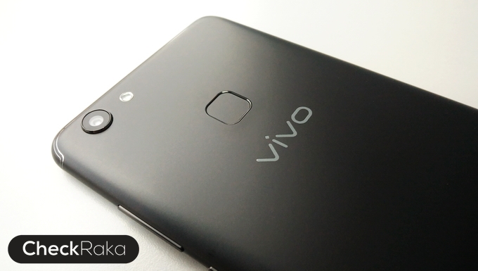 ด้านหลังมีกล้องหลังความละเอียด 16MP ค่ารูรับแสง F2.0 และไฟแฟลช LED ถัดลงมาจะเป็นเซ็นเซอร์สแกนลายนิ้วมือ และบริเวณโลโก้ Vivo จะเป็นสีโครเมี่ยมแวววาว