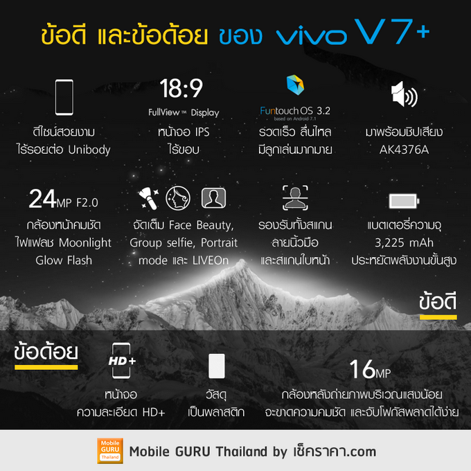 ชิปเซ็ต Qualcomm Snapdragon 450 CPU Octa-core 1.8 GHz Cortex-A53 GPU Adreno 506 RAM 4GB หน่วยความจำ 64GB (รองรับ MicroSD) ทดสอบด้วยแอปพลิเคชั่น Quadrant Standard ทำไปได้ 20,886 คะแนน ทดสอบด้วยแอปพลิเคชั่น AnTuTu Benchmark ทำไปได้ 59,003 คะแนน ทดสอบด้วยแอปพลิเคชั่น NenaMark2 ทำไปได้ 60.1 fps ทดสอบด้วยแอปพลิเคชั่น MultiTouch Tester รองรับ 10 จุด ทดสอบสัญญาณ GPS จับสัญญาณได้อย่างรวดเร็วดีมาก 2G GSM 900 / 1800 - SIM 1 & SIM 2 3G HSDPA 850 / 900 / 2100 4G LTE band 1(2100), 3(1800), 5(850), 7(2600), 8(900), 40(2300), 41(2500) Wi-Fi 802.11 b/g/n, WiFi Direct, DLNA, hotspot Bluetooth 4.2, A2DP, LE GPS, A-GPS, GLONASS microUSB 2.0, USB On-The-Go พอร์ตหูฟังขนาดมาตราฐาน 3.5 มม. เซ็นเซอร์ Fingerprint (rear-mounted), accelerometer, gyro, proximity, compass Vivo V7+ เป็นสมาร์ทโฟนหน้าจอไร้ขอบ FullView Display ที่น่าสนใจครับ มาพร้อมดีไซน์ และสเปคที่เหลือกินเหลือใช้ ใส่ฟีเจอร์มาให้เยอะมาก และกล้องคุณภาพดีโดยเฉพาะกล้องหน้า ที่นอกจากความละเอียด 24MP สูงที่สุดในตลาดตอนนี้แล้ว คุณภาพยังดีมากอีกด้วยถ่ายสนุก ที่น่าเสียดายก็อยู่ที่ชิปเซ็ตที่เลือกใช้ครับ แต่ถึงอย่างไรผมมองว่า Snapdragon 450 นั้นไม่ได้แย่มากนัก แถมยังใช้งานได้ดีอีกด้วย จริงๆ ถ้าจัด Series 6 มาให้ อาจจะถูกใจแฟนๆ ได้มากกว่า และวัสดุในราคานี้น่าจะเป็นโลหะนะครับ รวมทั้งความละเอียดหน้าจอควรจะให้มาที่ Full HD+ จะดูเหมาะสมกว่านี้ แต่รวมๆ แล้วสมาร์ทโฟนรุ่นนี้ไม่น่าผิดหวัง เป็นตัวเลือกที่ดีทีเดียวในราคา 11,990 บาท