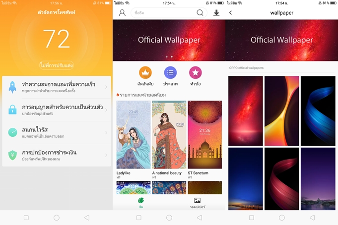 ฟีเจอร์ Clone Apps สามารถเล่นแอปพลิเคชั่นได้ 2 ID พร้อมๆ กันยังคงมีมาให้เช่นเคย รองรับ WhatsApp, Line และ BBM และฟีเจอร์จัดการโทรศัพท์ที่จะช่วยเคลียร์ RAM, ล็อคแอปพลิเคชั่น และอื่นๆในโทรศัพท์เพื่อความเป็นส่วนตัว, สแกนไวรัส และมีเพิ่มการปกป้องแอปธุรกรรมทางการเงินขึ้นมาด้วยครับ และที่น่าสนใจคือในส่วนของธีม มีการปรับปรุงเพิ่มธีมใหม่ๆเข้ามามากขึ้นแล้ว มีในส่วนของ Official Wallpaper ของ OPPO ด้วยนะครับ แต่ในส่วน Wallpaper ไม่มีการอัพเดทเพิ่มมานานพอสมควรแล้ว