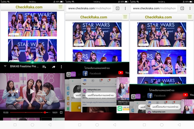 Multi Window หรือการใช้งาน 2 หน้าจอบน OPPO F5 ให้เปิดแอปพลิเคชั่นที่รองรับการใช้งานฟีเจอร์นี้ขึ้นมา และแตะที่ปุ่ม Multitasking จะเข้าสู่โหมด 2 หน้าจอกับแอปฯ ที่รองรับ (ซึ่งมีหลายแอปฯ เลยครับ ที่ไม่รองรับ รวมทั้งแอปฯ พื้นฐานบางตัว) การทำงานลื่นไหลดีครับ แต่ผมว่าแอปฯ ที่รองรับน้อยไปหน่อย รวมทั้งไม่ค่อยมีลูกเล่นเท่าที่ควร แต่บางคนอาจจะชอบนะครับ เพราะมันเรียบง่ายดี