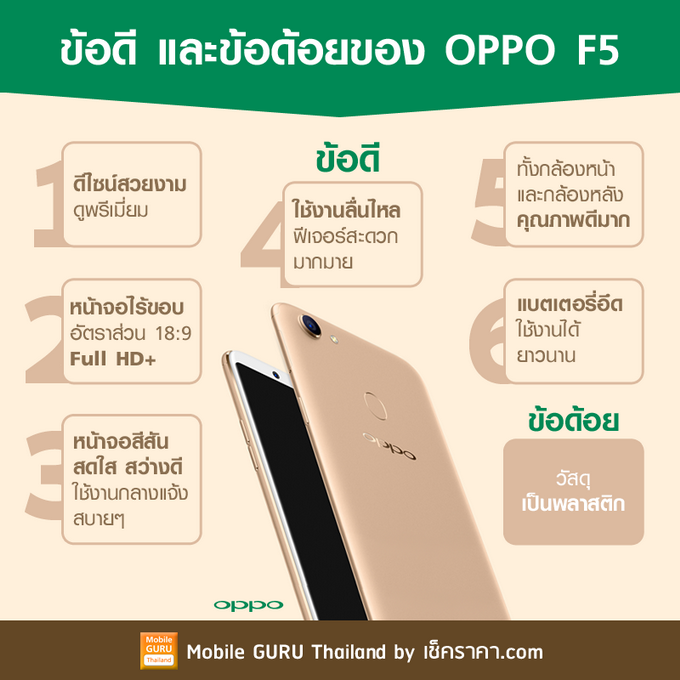 OPPO F5 เป็นสมาร์ทโฟนที่น่าสนใจครับ มาพร้อมมาตรฐานใหม่ๆ มากมาย ทั้งอัตราส่วนหน้าจอ และกล้องคุณภาพดี และเป็นโทรศัพท์มือถือที่ถ่าย Selfie ได้สวยในระดับต้นๆ ของตอนนี้ ในราคาไม่แพง รวมทั้งการใช้งานโดยรวมยังดีอีกด้วย ผมว่าเป็นตัวเลือกที่ผู้ใช้จะไม่ผิดหวังครับ จะติเรื่องเดียวก็ตรงวัสดุเป็นพลาสติกนี่แหละครับ
