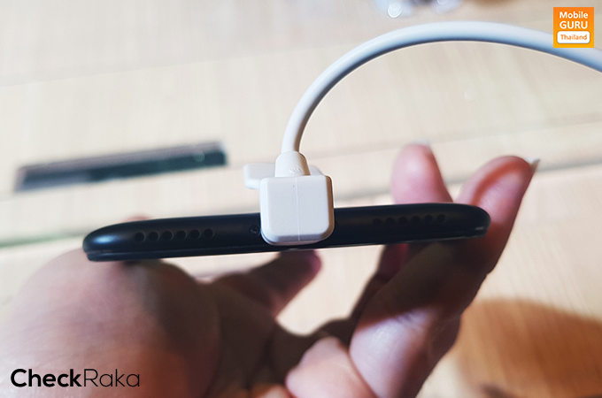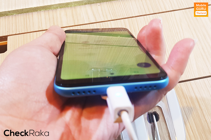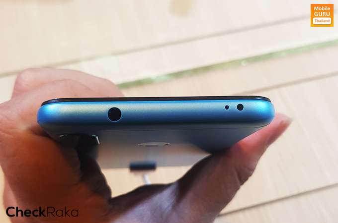 ด้านล่างของตัวเครื่อง มีลำโพงเสียงตัวเครื่อง, พอร์ต MicroUSB และไมค์สนทนา