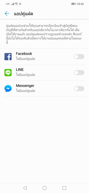โหมดการใช้งานแอปพลิเคชั่น Messenger พร้อมกันสองบัญชี โดยที่ทั้งสองบัญชีจะแยกการใช้งานออกจากกัน ทำให้สามารถจัดการบัญชีงานกับบัญชีส่วนตัวแยกออกจากกันได้สะดวก น่าจะถูกใจเหล่าพ่อบ้านใจกล้าทั้งหลายพอสมควร ซึ่งสามารถเข้าไปเปิดโหมดนี้ได้จากเมนู Setiing แอปพลิเคชั่นที่รองรับส่วนมากจะเป็นแอปฯ ตระกูลแชทหรือโซเชียลมีเดียทั้งหมด