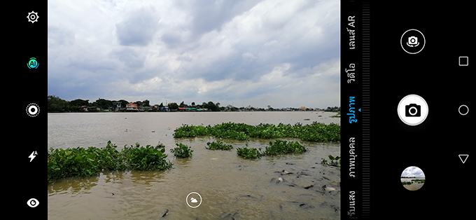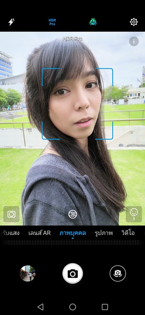 หน้า UI ของกล้องถ่ายรูปก็จะละหม้ายคล้ายคลึงกับรุ่นพี่ P20 เลย โดยสังเกตว่าถ้าหากเราเปิดโหมด AI (ปิดได้) ที่อยู่บริเวณแถบซ้ายมือไว้ พอเราเอากล้องไปเล็งกับวัตถุหรือสภาพแวดล้อมต่างๆ เพื่อเตรียมถ่าย ตัวกล้องก็จะขึ้นไอคอน AI Screne Recognition บริเวณกลางจอให้ทันที ทำให้เราทราบว่าตอนนี้ AI กำลังคิดว่าเราจะถ่ายภาพแนวไหนอยู่