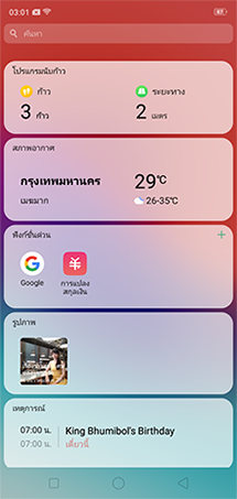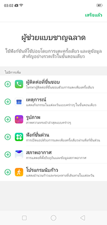 ในหน้า Home เมื่อ Swipe ด้านซ้าย จะเป็นระบบผู้ช่วยแบบชาญฉลาด Smart Assistant สำหรับการเข้าถึงฟังก์ชั่นที่ใช้งานบ่อยอย่างรวดเร็ว เช่น แอปพลิเคชั่น, สภาพอากาศ, โปรแกรมนับก้าว, รูปภาพ, นัดหมายและแจ้งเตือน, รายชื่อผู้ติดต่อที่ชื่นชอบ