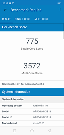 - ทดสอบด้วยแอปพลิเคชั่น GeekBench 4 ได้คะแนน Single Core 775 และ Multi Core 3,572 คะแนน