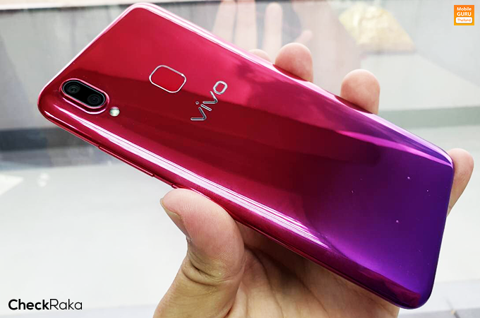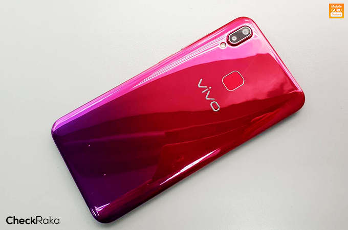 ด้านหลังตัวเครื่องมีการไล่เฉดสีแดง-ม่วง ทำให้ดูสีสันสดใส สวยแปลกตา ในขณะที่ด้านบนซ้ายมือจะมีเลนส์กล้องคู่ความละเอียด 13 + 2 ล้านพิกเซล พร้อมไฟแฟลช LED จัดวางไว้ข้างล่างเลนส์ ขยับลงมาตรงกลางมีแป้นเซนเซอร์สำหรับสแกนลายนิ้วมือ และโลโก้ Vivo เด่นเป็นเอกลักษณ์