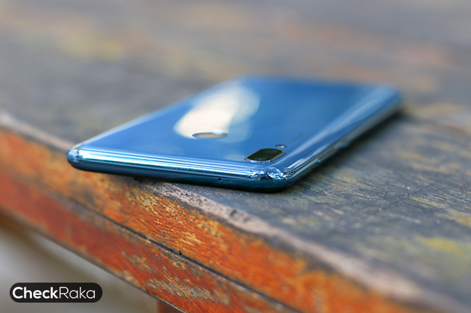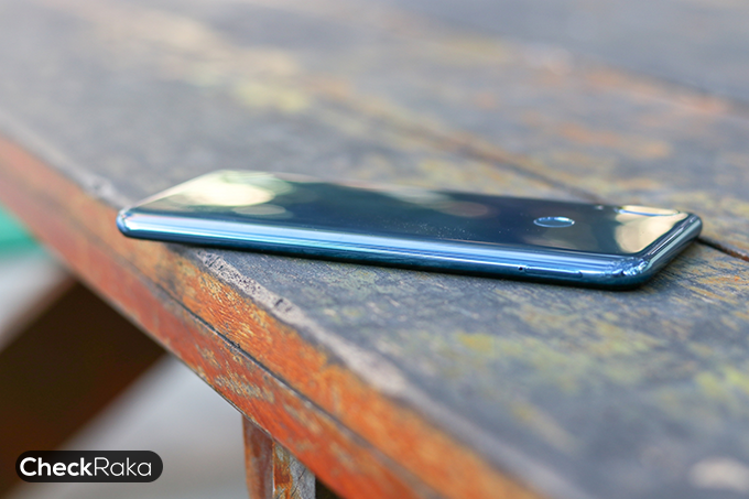 ด้านหลังของตัวเครื่อง วางกล้องถ่ายรูปคู่ความละเอียด 13 ล้านพิกเซล (F/1.8) + 2 ล้านพิกเซล (F/2.4) พร้อมไฟแฟลช LED และถัดลงมาเป็นเซ็นเซอร์สำหรับสแกนลายนิ้วมือที่มีลักษณะเป็นรูปวงกลมแบบยุบลงไป