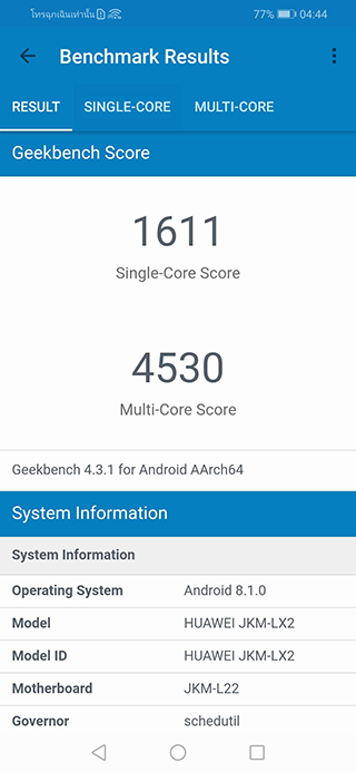 - ทดสอบด้วยแอปฯ GeekBench 4 ได้คะแนน Single Core 1,611 คะแนน และ Multi Core 4,530 คะแนน
