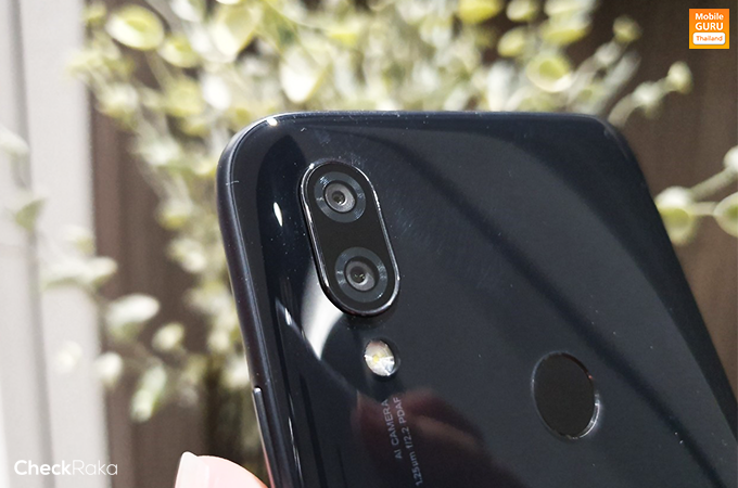 ด้านหลังตัวเครื่องมีกล้องถ่ายรูป Dual camera ความละเอียด 12+2 ล้านพิกเซล (F2.2) พร้อมไฟแฟลช LED ขยับลงมาตรงกลางมีแป้นสัมผัสสำหรับสแกนนิ้วมือ