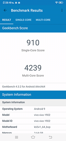 Vivo Y17 เลือกใช้ชิปประมวลผล MediaTek Helio P35 ซึ่งเป็นชิปประมวลผล Octa-core ที่ใช้สถาปัตยกรรม TSMC 12 nm FinFET ถ้าใครนึกภาพไม่ออก ให้ลองนึกถึง Snapdragon 625 ก็ได้ครับ แต่ P35 ให้ประสิทธิภาพการทำงานที่ดีกว่าหน่อย และเมื่อจับคู่ทำงานกับ RAM 4GB ทำให้การทำงาน หรือการใช้งานทั่วไปไม่ว่าจะเป็นเล่นโซเชียล, เปิดไฟล์เอกสาร ตอบไลน์ หรือดู Youtube บน Y17 นั้นตอบสนองได้ตามความต้องการ เมื่อเทียบกับราคาค่าตัว ผมให้ผ่านเลยละ