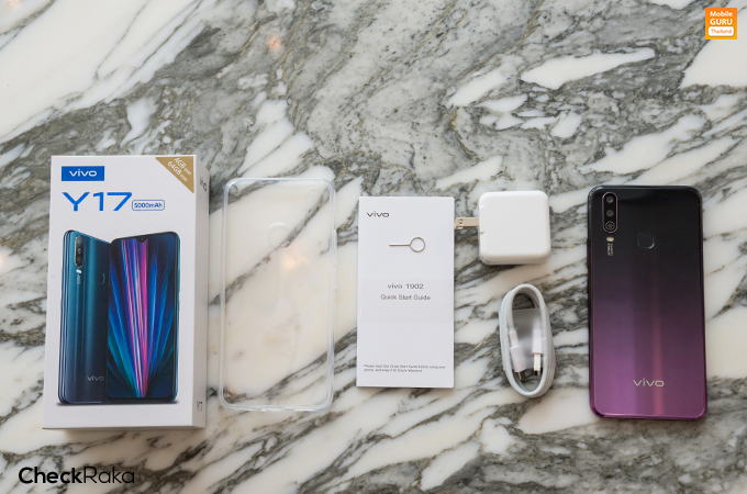 กล่องของ Vivo Y17 จะมาในโทนสีขาวเหมือนเดิม ที่มุมขวาบนจะมีแถบบอกขนาดของ RAM กับ ROM มาให้ ในขณะที่อุปกรณ์ภายในกล่องที่ให้มา จะมีคู่มือการใช้งาน, เคสใส (Soft case) เข็มจิ้มซิม, อแดปเตอร์ชาร์จไฟ และ สายชาร์จ MicroUSB