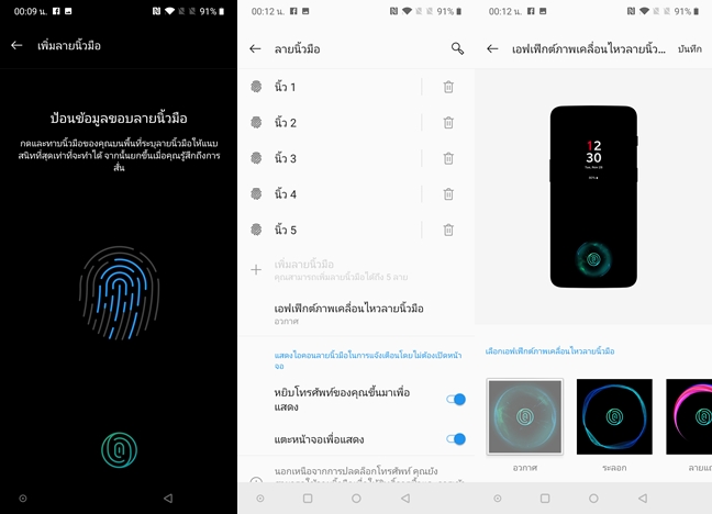 รุ่นนี้รองรับฟีเจอร์ Always On Display (AOD) และ Fingerprint (In-display) รองรับ 5 ลายนิ้วมือ (สามารถปรับแต่งเอฟเฟ็กต์ได้ด้วย สวยมากครับ) ความแม่นยำและความรวดเร็วทำได้ดีมากๆ รวมทั้งรุ่นนี้รองรับ Face Unlock สแกนใบหน้าด้วยนะครับ เวลาใช้งานกล้องหน้าแบบ Pop-Up จะเด้งขึ้นมาตรวจจับใบหน้าอัตโนมัติดูเท่มากจริงๆครับ
